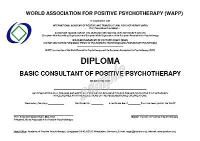 По окончании каждого модуля (30 часов) выдается промежуточный сертификат, после выпускного коллоквиума вы получаете немецкий сертификат Basic Consultant of Positive Psychotherapy, действительный в 84 странах мира.
