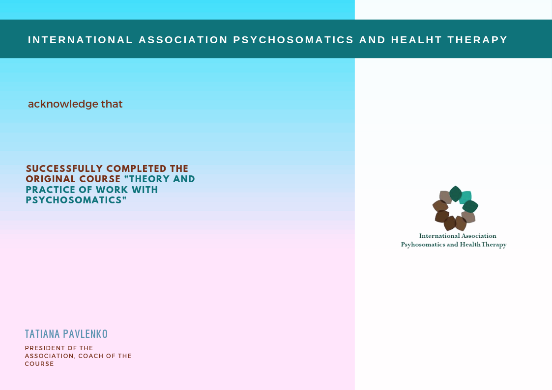 По окончанию семинара вы получаете 2 документа, среди которых, сертификат повышении квалификации от «МЕЖДУНАРОДНАЯ АССОЦИАЦИЯ ПСИХОСОМАТИКИ И ТЕЛЕСНОЙ ТЕРАПИИ» и автоматически СТАНОВИТЕСЬ ЧЛЕНАМИ АССОЦИАЦИИ.